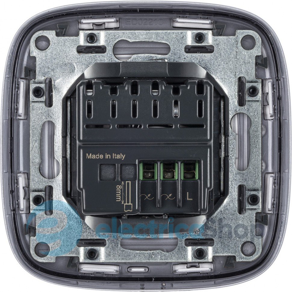 Поставляется с захватами, декоративной рамкой, суппортом, лицевой панелью и защитной крышкой. Крепление на винтах или захватах. Может управляться умными беспроводными выключателями.