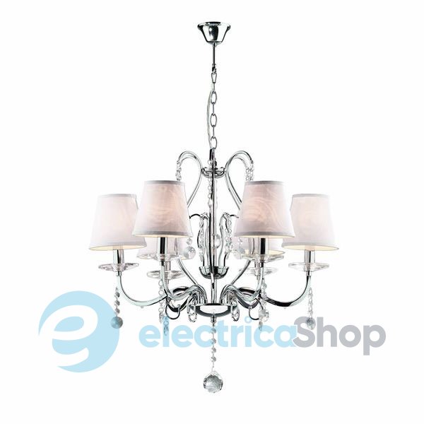 Люстра Ideal Lux 32597 SENIX прекрасно подойдет для интерьеров в современном стиле. Основание выполнено из хромированного металла. Плафон изготовлен из пластика, покрытого тканью с рельефным цветочным рисунком. Подвески хрустальные прозрачные.