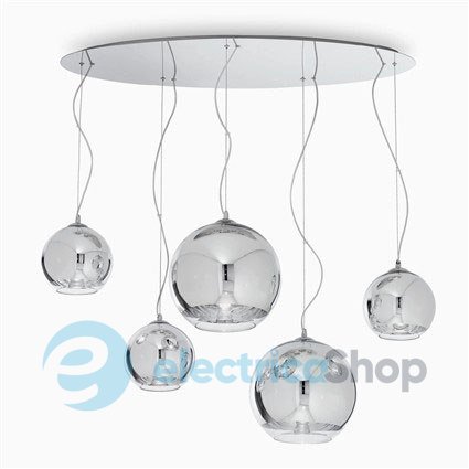 Люстра прекрасно будет смотреться в современных интерьерах. Основание люстры выполнено из хромированного металла, плафон из дутого стекла с зеркальным напылением и нижней прозрачной прослойкой. Трос стальной. Высота регулируется.