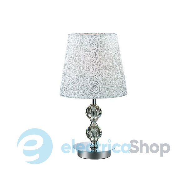 Настольная лампа подойдет для интерьеров в современном стиле. Основание выполнено из металла с хромовым покрытием и прозрачного стекла. Плафон пластиковый с тканевой обшивкой белого цвета с блестками.