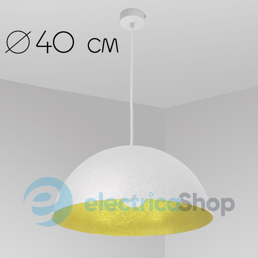 Подвесной светильник ImperiumLight 07140.01.12 D.40 см, белый/золото (металлик) очень хорошо будет смотреться в кафе, барах, ресторанах, в офисных помещениях, а также подчеркнет индивидуальность вашего дома. Лаконичный дизайн и модное цветовое решение дает возможность использовать светильник в современных интерьерах. Диаметр подвеса - 60 см, высота плафона - 30 см, длина светильника - 155 см.