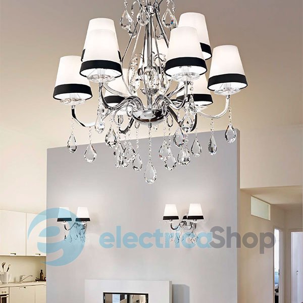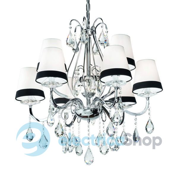 Люстра Ideal Lux 93277 DOMUS подойдет для интерьера в классическом стиле. Абажуры выполнены из ПВХ и обтянуты полотном двух цветов, арматура - из хромированного металла. Декоративные элементы (подвески) изготовлены из хрусталя с фацетом.