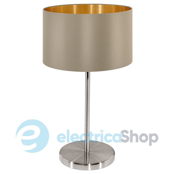 Настольная лампа 31629 Eglo MASERLO из стильной текстильной коллекции Эгло будет отлично смотреться в помещениях, оформленных в современном стиле. Арматура осветительного прибора выполнена из металла, плафон - из ткани (цвет "taupe" снаружи и золотистый внутри).