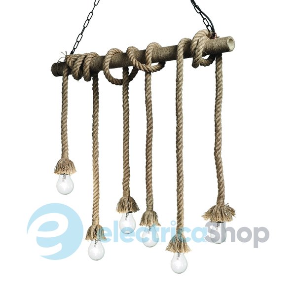 Неординарная люстра Ideal Lux 134826 Canapa будет здорово смотреться в помещениях, оформленных в стиле винтаж. Металлическая арматура и электрические шнуры полностью покрыты конопляной веревкой натурального цвета.
