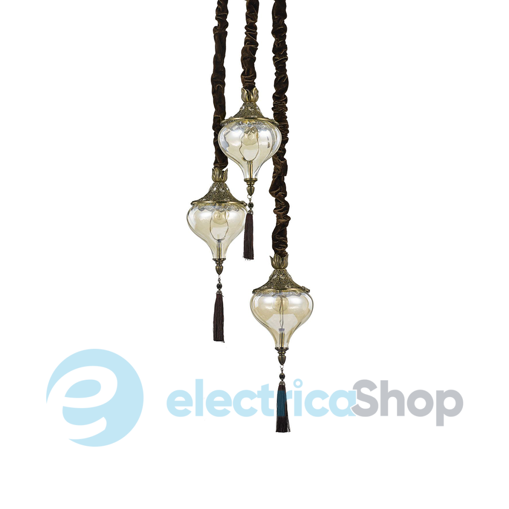 Люстра Ideal Lux 115986 Harem будет здорово смотреться в помещениях, оформленных в восточном стиле. Арматура осветительного прибора выполнена из металла с рельефными декорациями и встроенными восьмиугольными хрусталиками с фацетом, рассеиватели - из дутого прозрачного стекла слегка янтарного цвета с висящими кисточками. Цепь скрыта бархатной тканью.