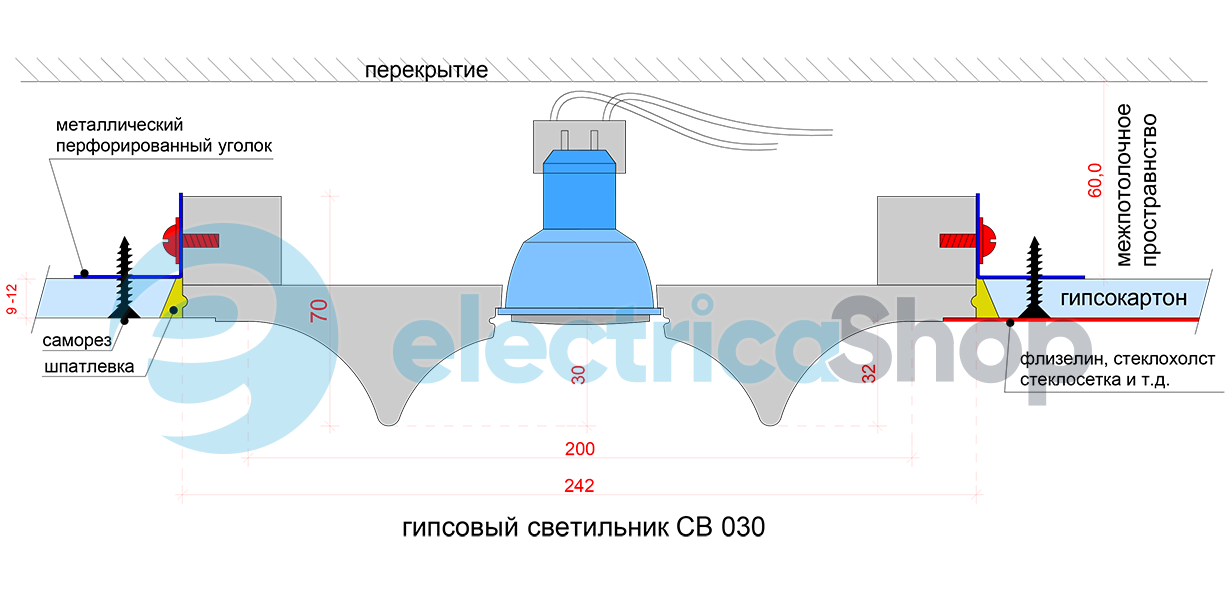 - Осветительный прибор монтируется в потолок на одном уровне с гипсокартоном.
