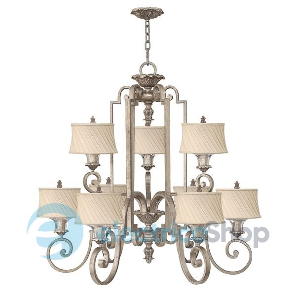 Роскошная люстра Elstead HK/KINGSLEY9 станет настоящим украшением для интерьера. Ручная отделка Silver Leaf гармонично сочетается с элегантными стеклянными элементами, плиссированной тканью цвета слоновой кости и декоративными литьевыми накладками.