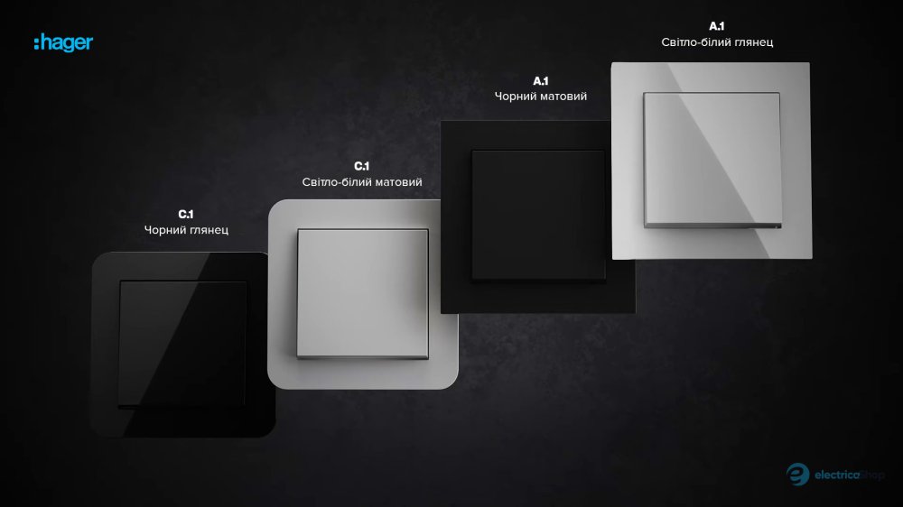 У новій програмі електрофурнітури Hager представлені серії A1, C1, A8 та C8. Вони відрізняються сучасним дизайном, широкою палітрою кольорів та сумісністю з механізмами Berker.
