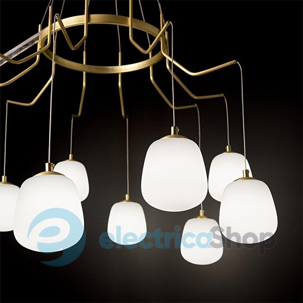 Арматура виготовлена з металу з покриттям під латунь. Плафони білого кольору з дутого скла. Максимальна висота підвісу – 1330 мм.Характеристики