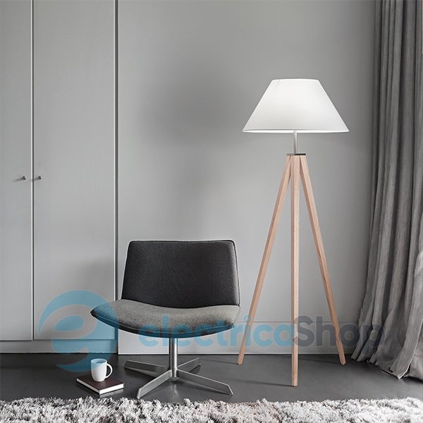 Торшер Ideal Lux TRIDENTE PT1 146317 підкреслить індивідуальність вашого будинку, матиме чудовий вигляд у сучасних інтер'єрах. Тринога з натурального дерева прикрашена абажуром з ПВХ, що вкритий білою тканиною. При включеному світлі створюється гарний м'який акцент. Арматура металева кольору нікель матовий.