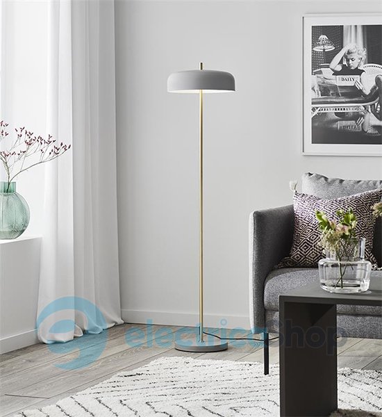 Торшер MARKSLOJD Caen 107923 матиме гарний вигляд у сучасному інтер'єрі, підійде для стилістики модерн. Стильне оформлення не перевантажує інтер'єр і створює гарний акцент. Арматура металева з покриттям під античну латунь, плафон сірого кольору. Довжина кабелю – 2 м, вимикач на шнурі.