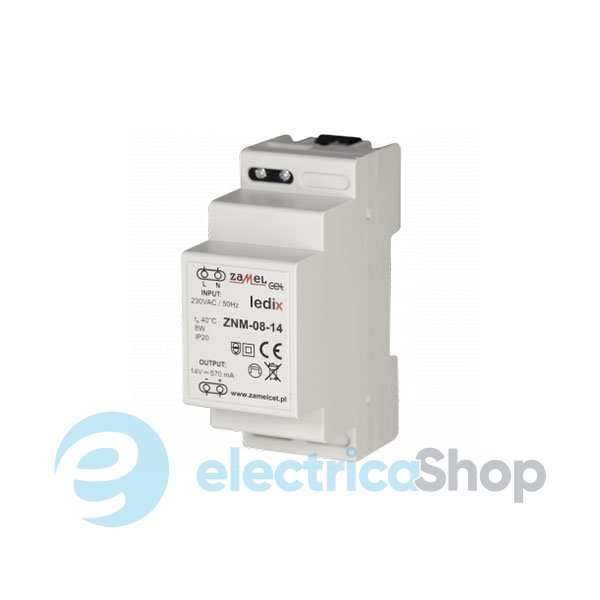 Блок живлення ZNM-08-14 – це професійне імпульсне джерело живлення з вихідною напругою 14V постійного струму та потужністю 8W. Призначений для роботи з продуктами LEDIX з напругою живлення 14V DC. Блок живлення ZNM призначений для монтажу на шині TH-35. Пристрій виготовлений в 2-х модульному корпусі. Висока ефективність та дуже низька потужність в режимі очікування створюють економічне рішення, розраховане на безперервну роботу.