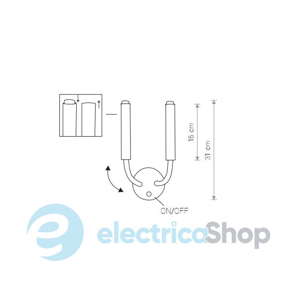 Виготовлений з металу, покриття плафонів чорного кольору. Кількість джерел світла – 2. Вимикач на корпусі.