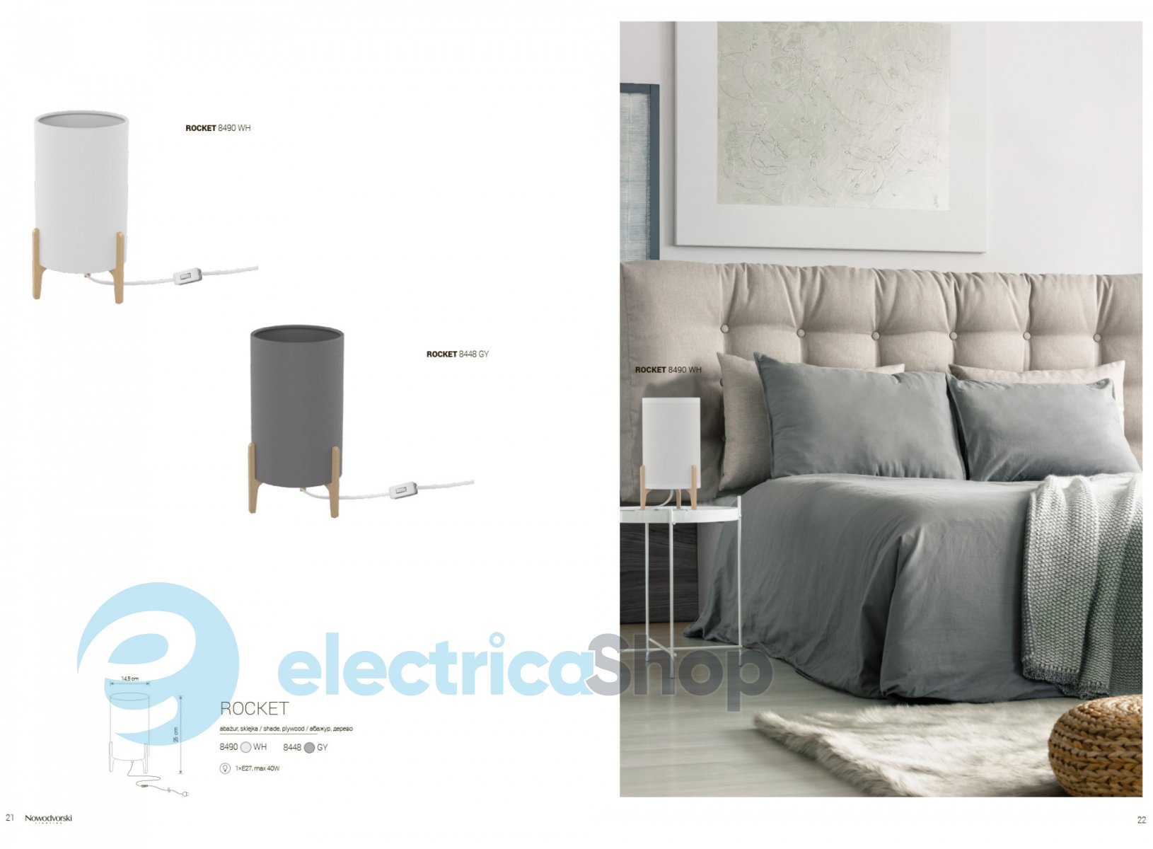 Настільна лампа Nowodvorski ROCKET WHITE 8490 матиме гарний вигляд у сучасних інтер'єрах. Основа виготовлена з дерева, абажур текстильний. Вимикач знаходиться на шнурі.
