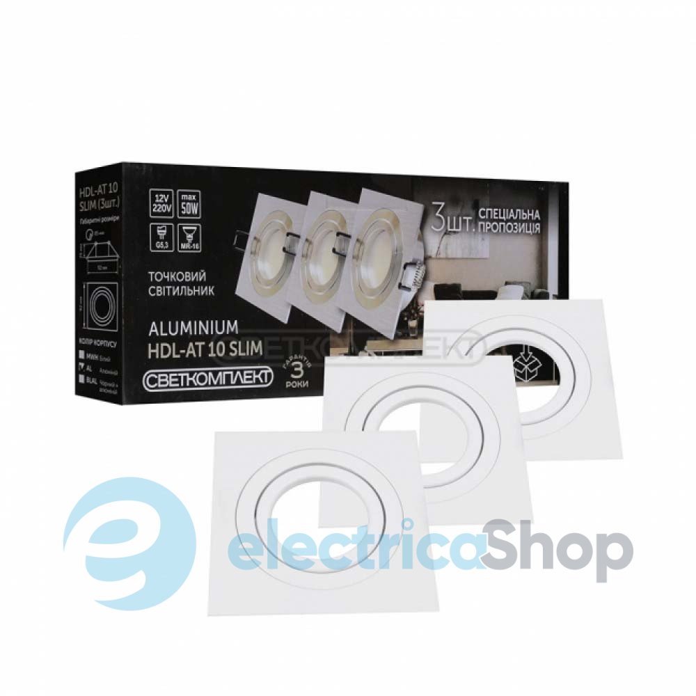 Врізний точковий світильник Светкомплект HDL-AT 10 MWH Slim матиме гарний вигляд у сучасних інтер'єрах, допоможе створити необхідні світлові акценти. Виготовлений з алюмінію в білому кольорі. У коробці – 3 шт.