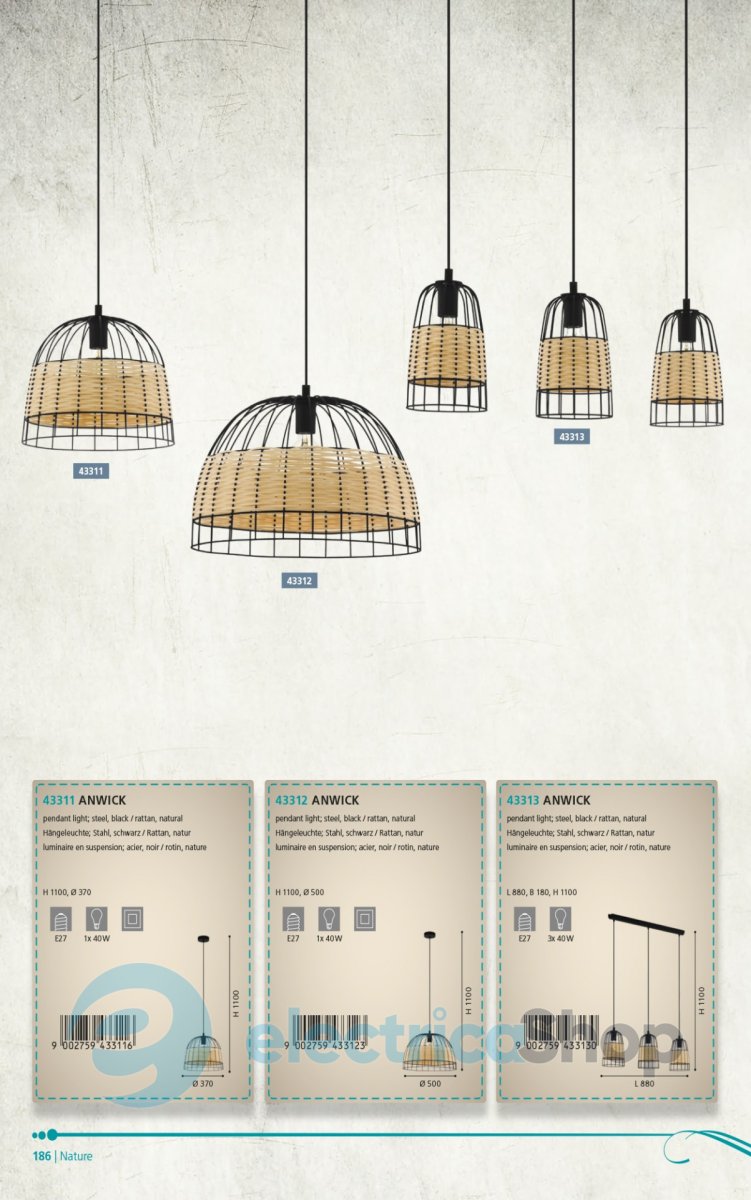 Люстра ANWICK 43313 австрійського бренду EGLO матиме гарний вигляд у сучасному інтер'єрі, доповнить дизайн будь-якого приміщення. Виготовлена зі сталі, оздоблення чорного кольору, на плафонах декор із ротанга.