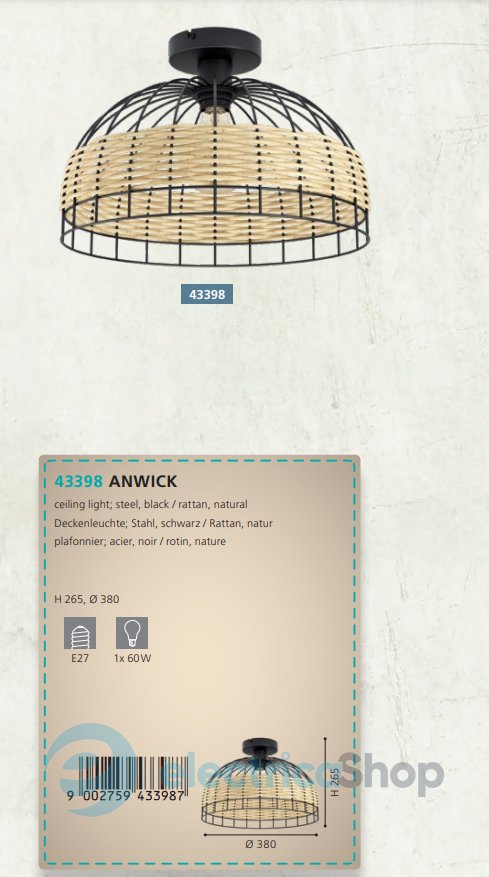 Люстра ANWICK 43398 австрійського бренду EGLO матиме гарний вигляд у сучасному інтер'єрі, доповнить дизайн будь-якого приміщення. Виготовлена зі сталі, оздоблення чорного кольору, на плафоні декор із ротанга.