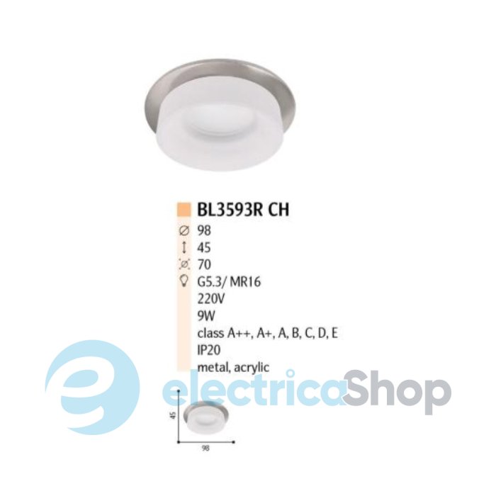 Стильний та лаконічний точковий світильник Blitz Leuchten 3593R CH стане справжньою окрасою для сучасного інтер'єру. Виготовлений з металу та акрилу. Тип лампи – G5.3/MR16, максимально 9W.