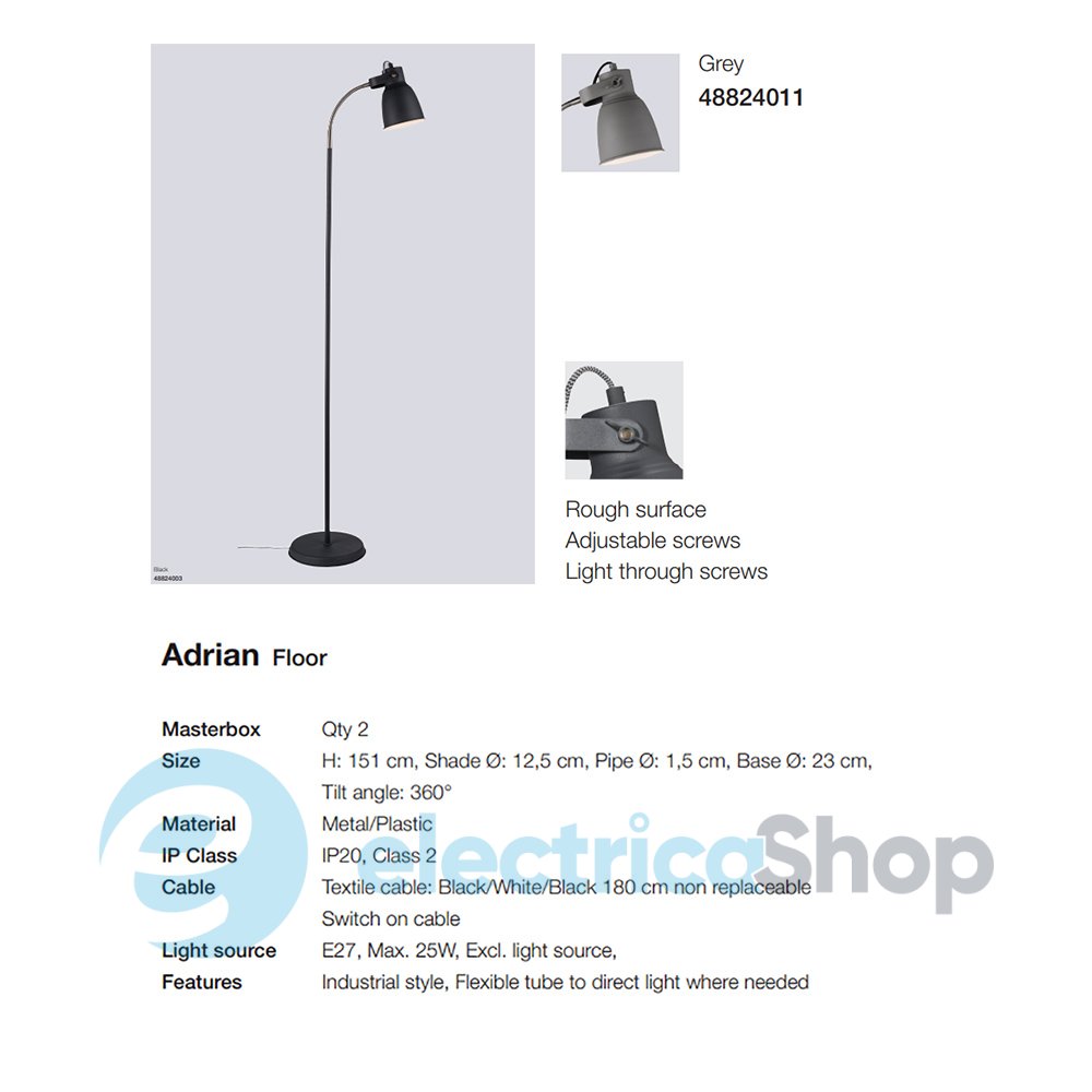 Торшер Nordlux ADRIAN 48824011 матиме гарний вигляд у сучасному інтер'єрі, доповнить простір біля ліжка або робочої зони, місця для читання. Чудово поєднується зі стилістикою лофт та кантрі. Довжина кабелю – 1,8 м, вимикач на шнурі.