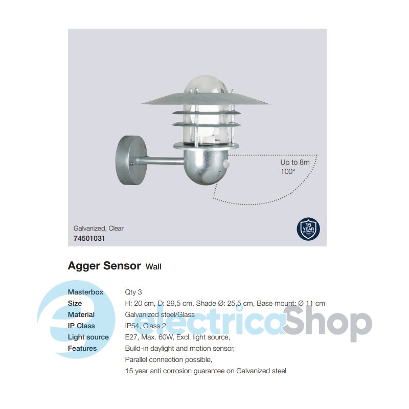 Вуличний світильник Nordlux AGGER 74501031 Sensor виготовлений з оцинкованої сталі, що робить його стійким до північних кліматичних умов. Його рекомендується розміщувати в місцях з підвищеною вологістю, прибережних зонах. Підходить для енергозберігаючих та світлодіодних ламп.