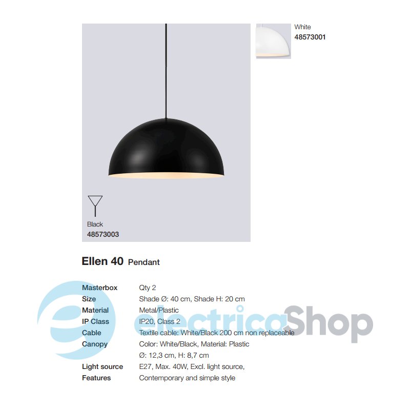Підвісний світильник Nordlux ELLEN 40 48573001 матиме гарний вигляд у сучасному інтер'єрі, доповнить простір над робочим столом або обідньою зоною. Чудово поєднується зі стилістикою мінімалізм та модерн. Довжина кабелю – 2 м.