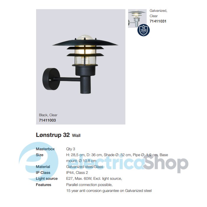 Вуличний світильник Nordlux LONSTRUP 32 71411003 виготовлений з оцинкованої сталі, що робить його стійким до північних кліматичних умов. Його рекомендується розміщувати в місцях з підвищеною вологістю, прибережних зонах. Підходить для енергозберігаючих та світлодіодних ламп.