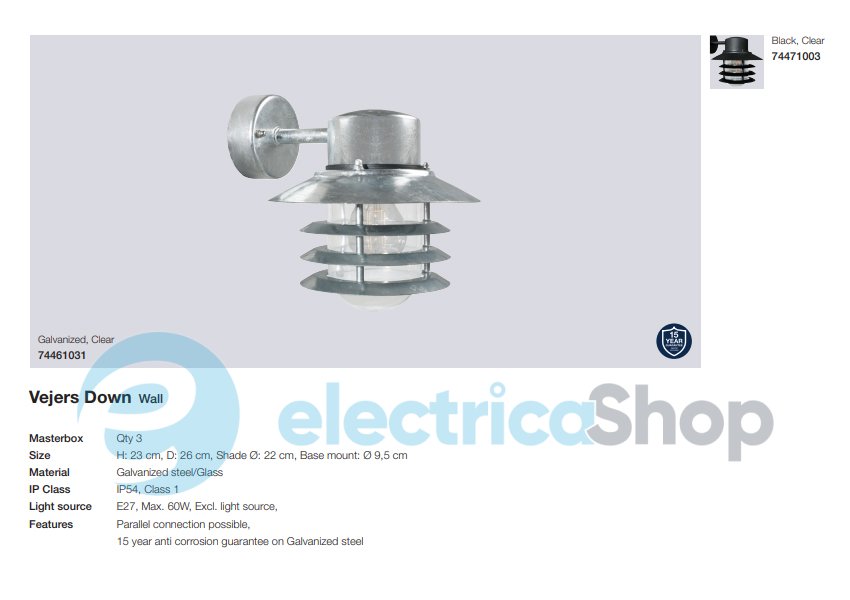 Вуличний світильник Nordlux VEJERS Down 74461031 виготовлений з оцинкованої сталі, що робить його стійким до північних кліматичних умов. Його рекомендується розміщувати в місцях з підвищеною вологістю, прибережних зонах. Підходить для енергозберігаючих та світлодіодних ламп.