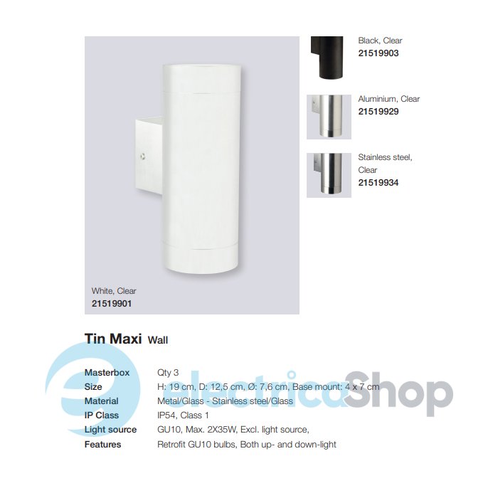 Вуличний світильник Nordlux TIN MAXI 21519901 виготовлений з металу та скла. Стане чудовим рішенням для підсвічування фасадів будівель. Має високий ступінь пиловологозахисту IP54. Його рекомендується розміщувати в місцях з підвищеною вологістю, оскільки світильник стійкий до корозії. Світло в даній моделі спрямоване вгору й вниз.