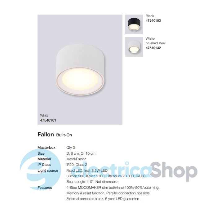 Точковий накладний світильник Nordlux FALLON 47540101 матиме гарний вигляд у сучасному інтер'єрі, доповнить простір житлових і громадських приміщень. Має вбудований LED-модуль на 8,5W, колірна температура – 2700K (теплий білий). Доступні три рівня яскравості (внутрішнє та зовнішнє кільце світла).