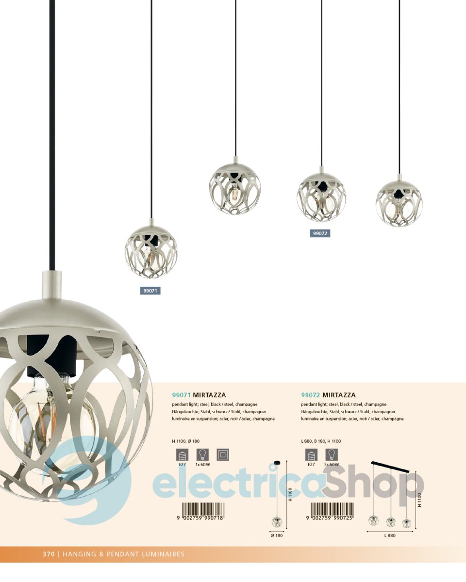 Люстра MIRTAZZA 99071 австрійського бренду EGLO матиме гарний вигляд у сучасному інтер'єрі, доповнить дизайн будь-якого приміщення. Виготовлена зі сталі.