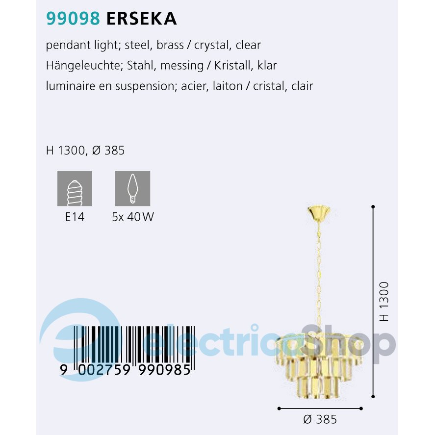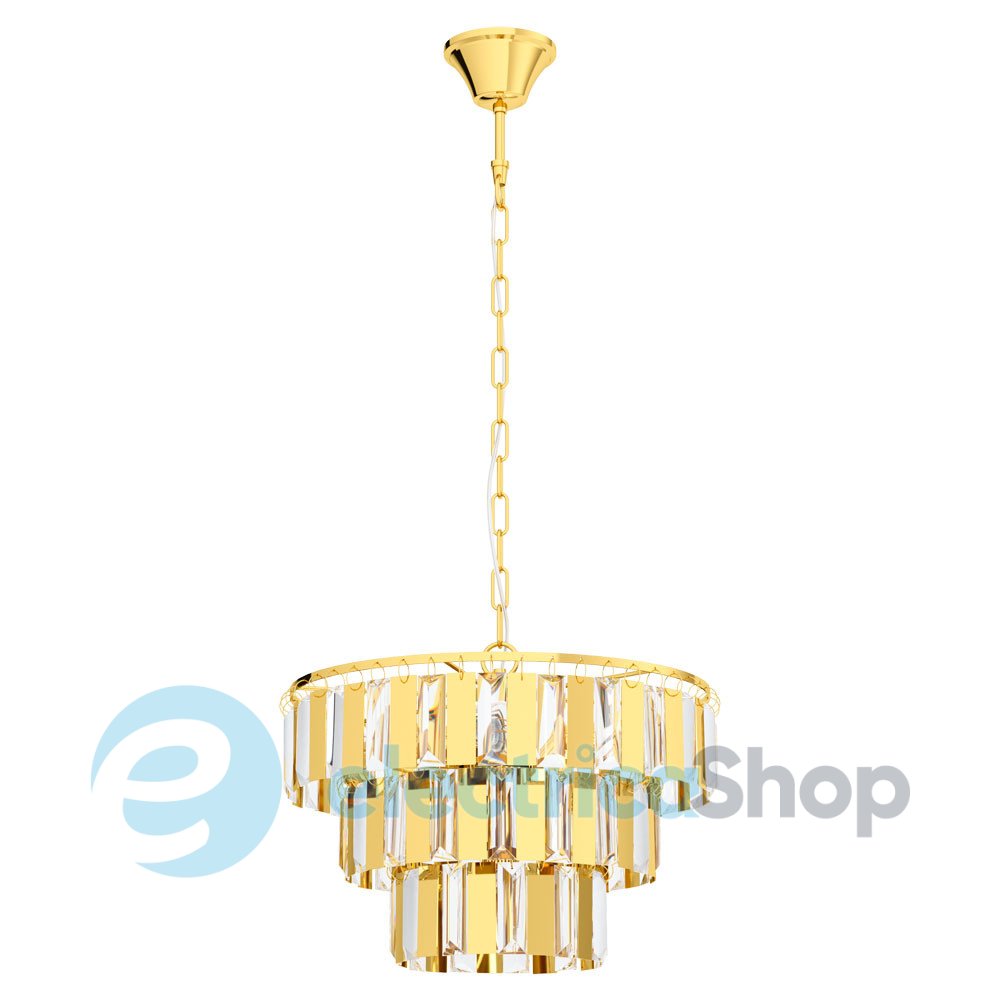 Люстра ERSEKA 99098 австрійського бренду Eglo™ стане справжньою окрасою для сучасного інтер'єру, пасуватиме до стилю модерн. Виготовлена зі сталі, плафон декорований кришталем.