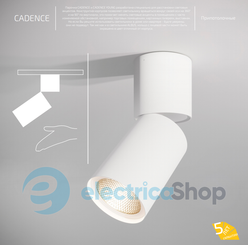 Світильник-спот BARVANOR Cadence CD-SR-02940038RF490-RAL9003 розроблений спеціально для розстановки світлових акцентів. Конструктив корпусу дозволяє світильнику обертатися навколо своєї осі на 360° і на 90° по вертикалі, це допомагає змінювати світлові акценти в приміщеннях із часто змінюваною обстановкою, наприклад, торгових приміщеннях, картинних галереях, виставках. Кут розсіювання світла: 38°.
