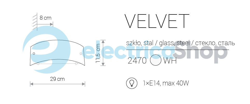 Настінний світильник Nowodvorski VELVET classic S 2470 матиме гарний вигляд у сучасному дизайні, створить світлові акценти. Виготовлений зі скла та металу.