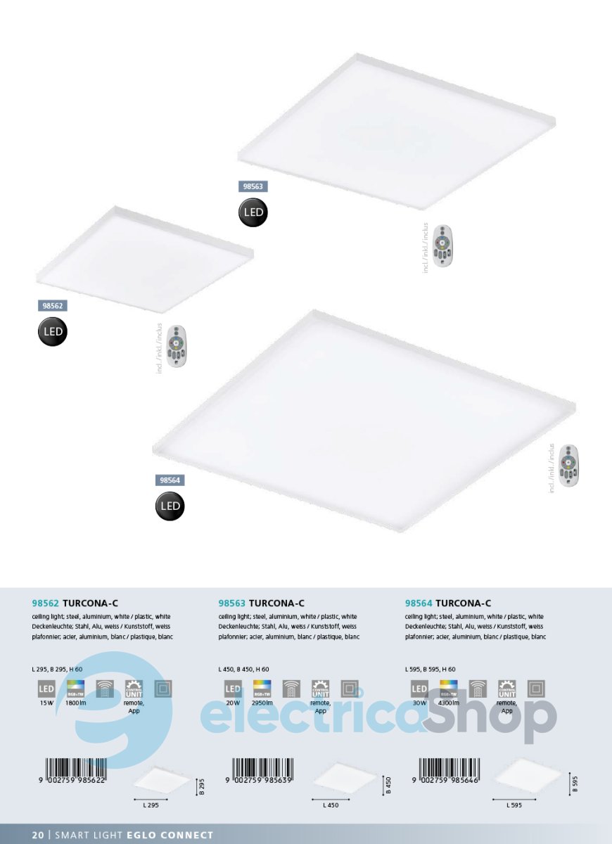 Світильник Eglo TURCONA-С 98564 добре впишеться в інтер'єр, оформлений в сучасному стилі. Виготовлений із сталі, алюмінію та пластика, монтується на стелю. Керувати led-панеллю можна за допомогою мобільного додатку або пульта ДК.