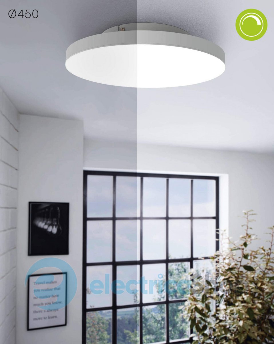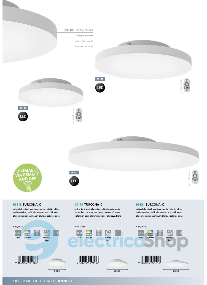 Світильник Eglo TURCONA-С 99121 добре впишеться в інтер'єр, оформлений в сучасному стилі. Виготовлений із сталі, алюмінію та пластика, монтується на стелю. Керувати світильником можна за допомогою мобільного додатку або пульта ДК.