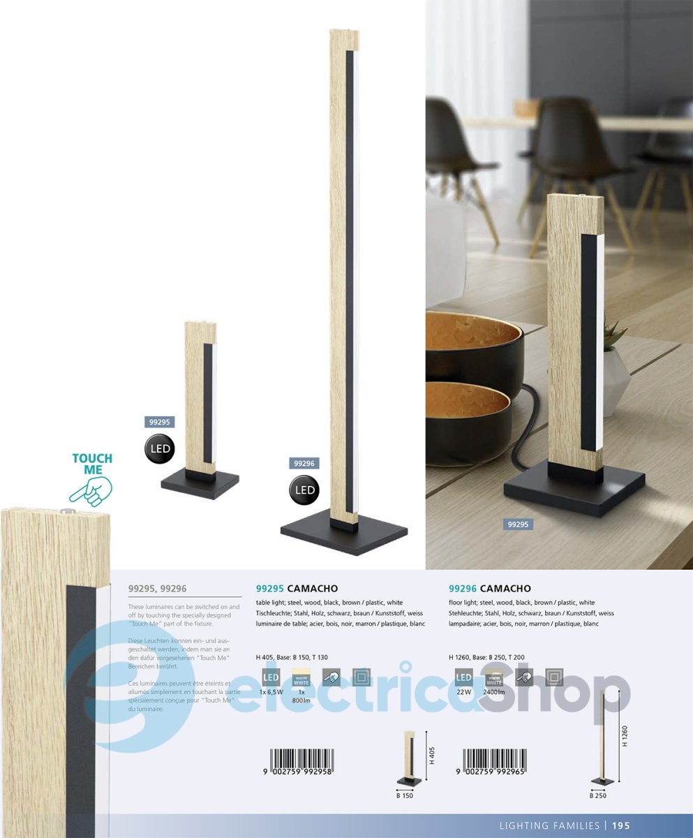 Настільна лампа Eglo CAMACHO 99295 – це стильне доповнення для житлових і комерційних просторів. Універсальний та модний дизайн дозволяє використовувати світильник у сучасних інтер'єрах, стилістиці лофт. Каркас виготовлений зі сталі та дерева, плафон – із пластика. Має вбудований LED-модуль на 6,5W, колірна температура – 3000K (теплий білий), на корпусі є сенсорний вимикач.