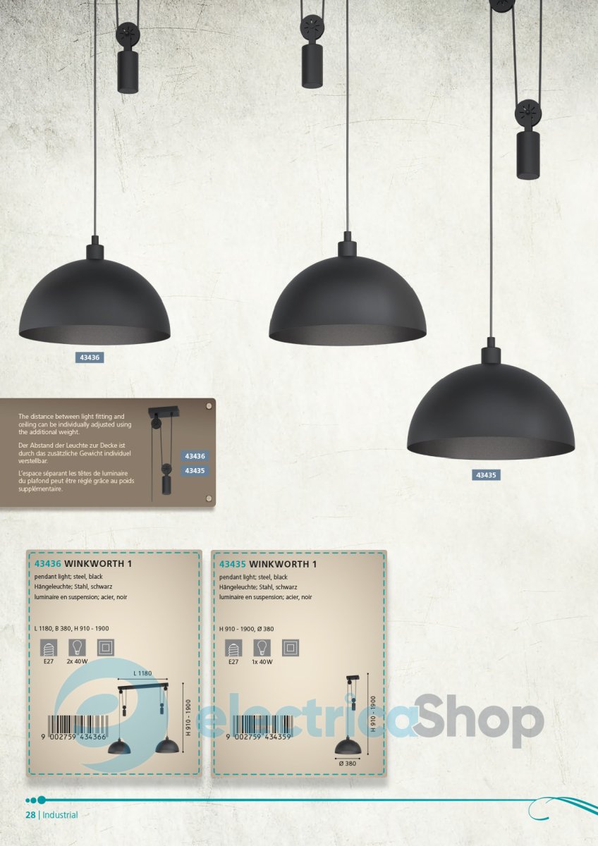 Підвісний світильник Eglo WINKWORTH 1 43436 матиме гарний вигляд у сучасному інтер'єрі, доповнить дизайн будь-якого приміщення. Виготовлений з металу, покриття чорного кольору. Висота підвісу регулюється.