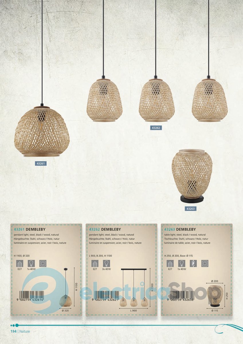 Люстра DEMBLEBY 43262 австрійського бренду EGLO матиме гарний вигляд у сучасному інтер'єрі, доповнить дизайн будь-якого приміщення. Основа виготовлена зі сталі, плафони – з дерева.