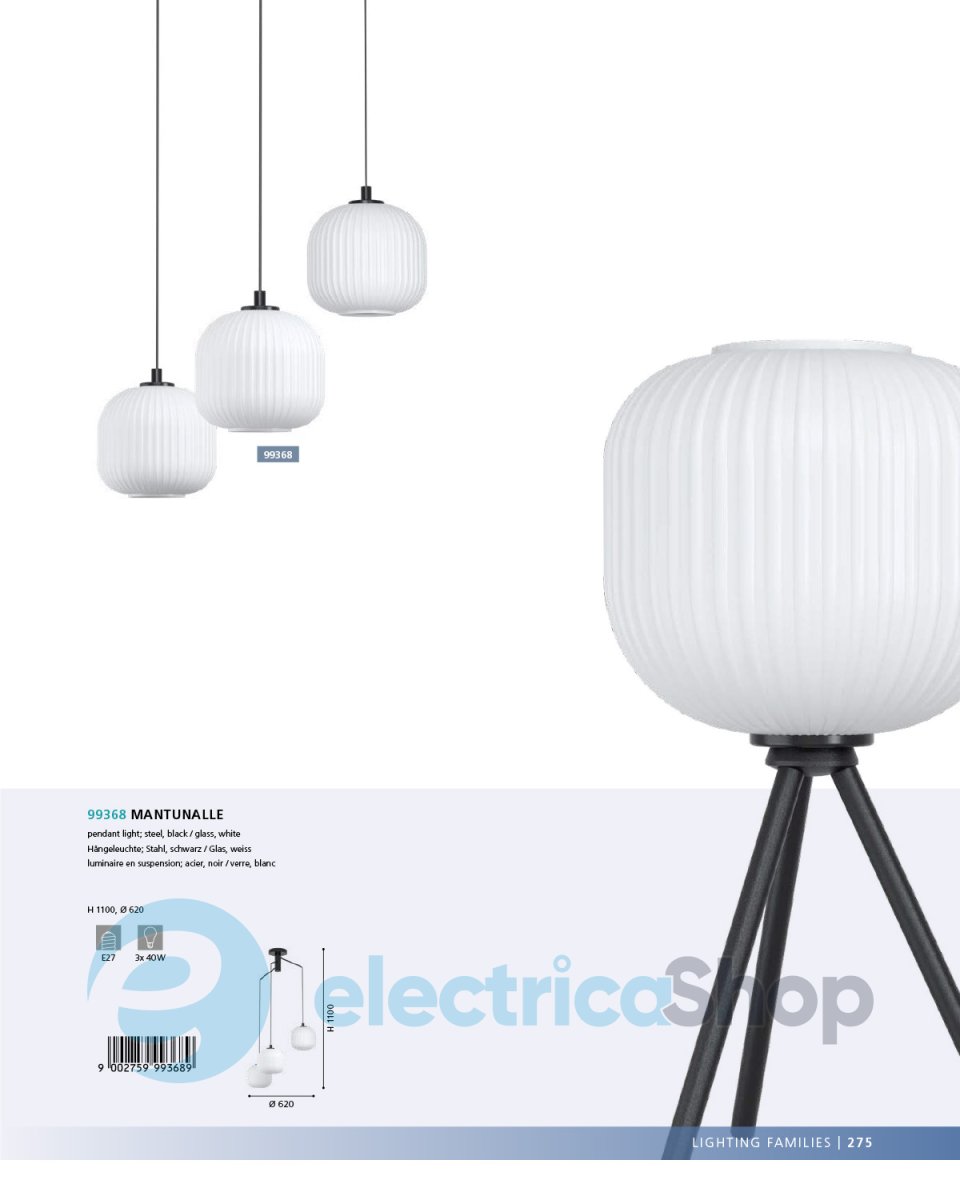 Люстра MANTUNALLE 99368 австрійського бренду EGLO матиме гарний вигляд у сучасному інтер'єрі, доповнить дизайн будь-якого приміщення. Виготовлена зі сталі, плафони скляні.