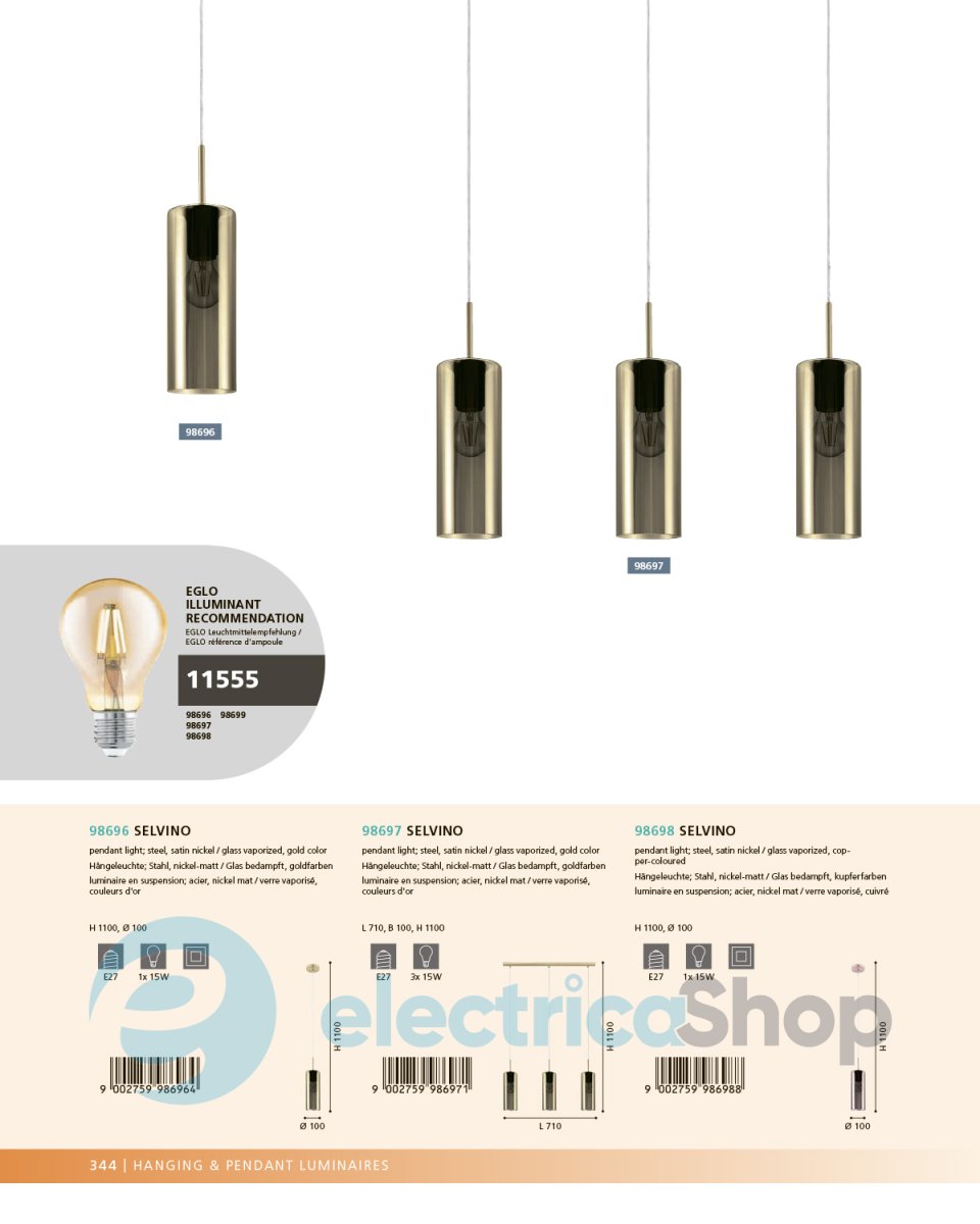 Люстра SELVINO 98696 австрійського бренду EGLO матиме гарний вигляд у сучасному інтер'єрі, доповнить дизайн будь-якого приміщення. Виготовлена зі сталі, плафон скляний.