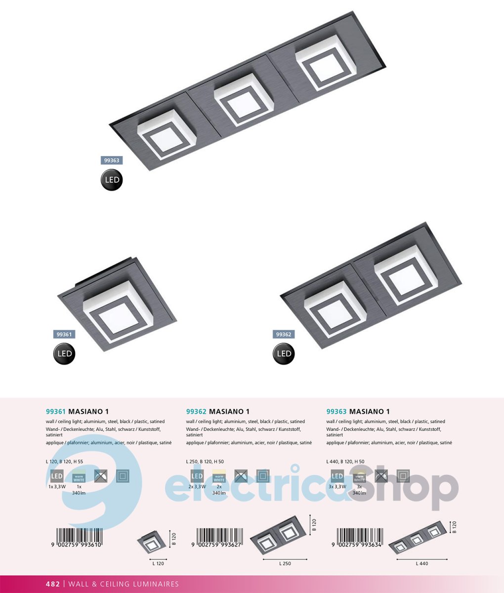 Світильник Eglo MASIANO 1 99361 стане чудовим рішенням для сучасних інтер'єрів. Виготовлений зі сталі, алюмінію та пластику, кріпиться на стіну або стелю. Вбудований led-модуль (3,3W), колірна температура – 3000K (теплий білий).