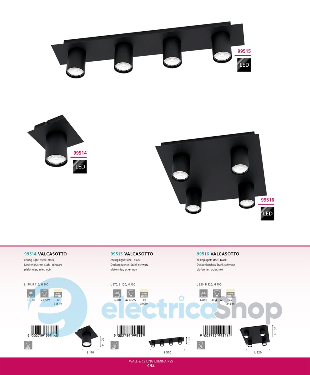 Спот VALCASOTTO 99516 австрійського бренду EGLO матиме гарний вигляд у сучасному інтер'єрі, доповнить дизайн будь-якого приміщення. Світильник виготовлений зі сталі. В комплекті LED-лампи GU10 4 x 4,5W, колірна температура – 3000K (теплий білий).