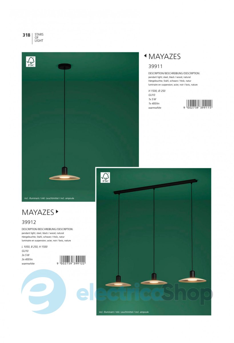 Підвісний світильник MAYAZES 39912 австрійського бренду EGLO матиме гарний вигляд у сучасному інтер'єрі, доповнить дизайн будь-якого приміщення та додасть декоративних акцентів. Основа виготовлена зі сталі, плафони – з дерева. В комплекті LED-лампи.