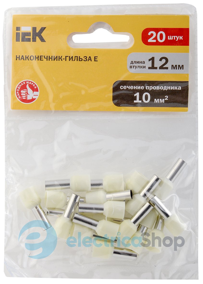– Тип: Наконечник-гільза Е10-12 10мм2 (слонова кістка 20шт) ІЕК. уп.Цей вид наконечників призначений для окінцювання багатодротяних гнучких проводів. Зачищений кінець багатожильного дроту заводять у середину порожнистої трубки, а потім опресовують разом із трубкою за допомогою спеціального інструменту, утворюючи єдину конструкцію, що надійно фіксує пучок багатодротової жили.