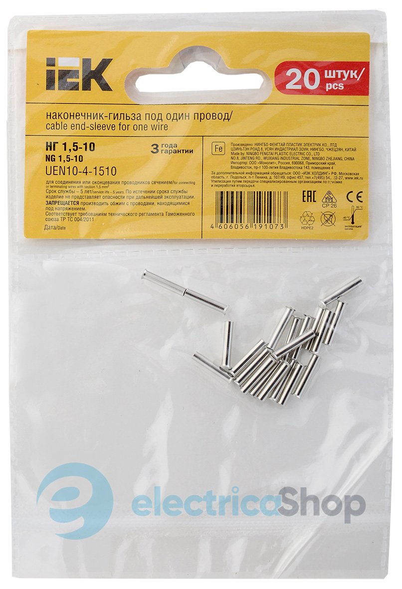 – Тип: Наконечник-гільза НГ 1.5-10 без ізоляції (20 шт) ІЕК. уп.Наконечники призначені для з'єднання або окінцювання дротів та кабелю з мідними або алюмінієвими жилами.