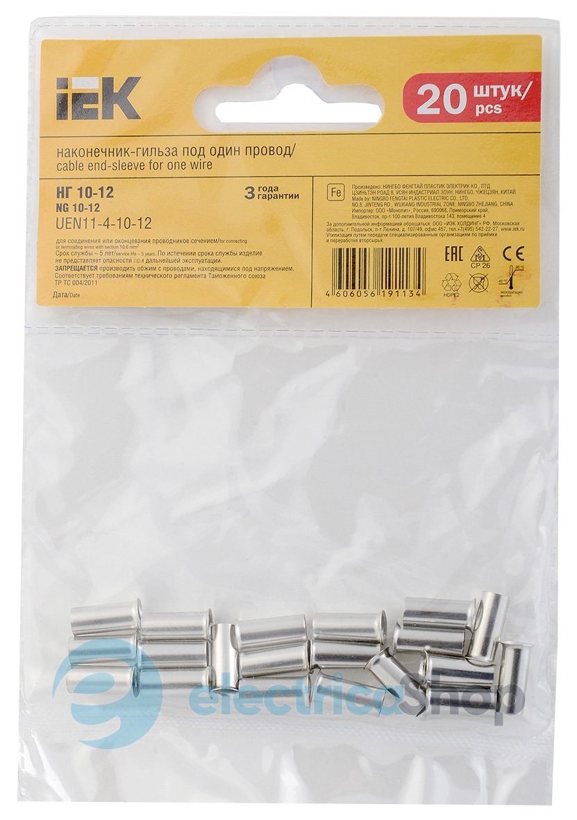 – Тип: Наконечник-гільза НГ 10-12 без ізоляції (20 шт) ІЕК. уп.Наконечники призначені для з'єднання або окінцювання дротів та кабелю з мідними або алюмінієвими жилами.