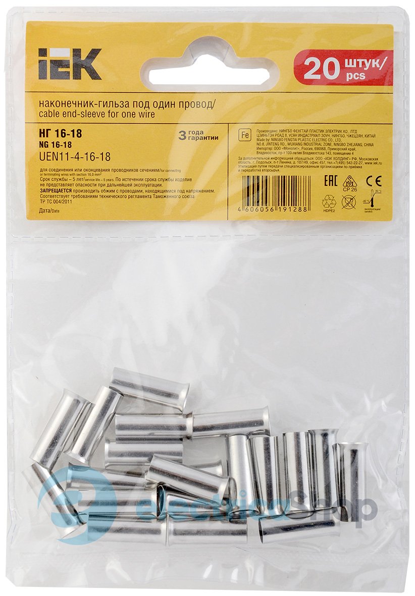 – Тип: Наконечник-гільза НГ 16-18 без ізоляції (20 шт) ІЕК. уп.Наконечники призначені для з'єднання або окінцювання дротів та кабелю з мідними або алюмінієвими жилами.