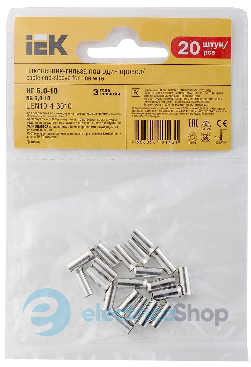 – Тип: Наконечник-гільза НГ 6.0-10 без ізоляції (20 шт) ІЕК. уп.Наконечники призначені для з'єднання або окінцювання дротів та кабелю з мідними або алюмінієвими жилами.