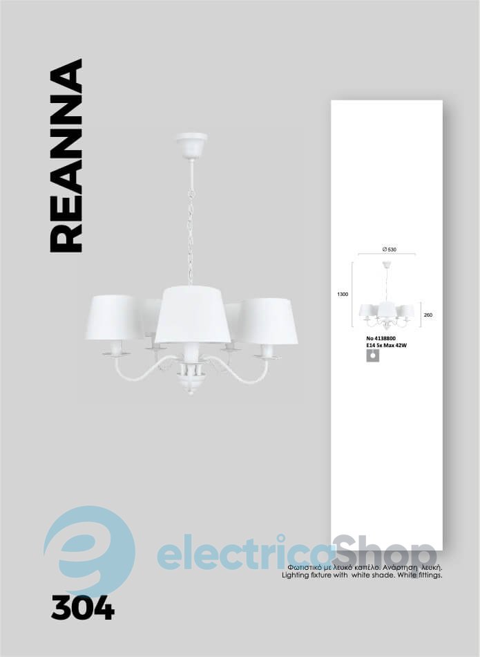 Люстра Viokef REANNA 4138800 матиме чудовий вигляд у сучасному інтер'єрі, доповнить дизайн будь-якого приміщення та додасть декоративні акценти.