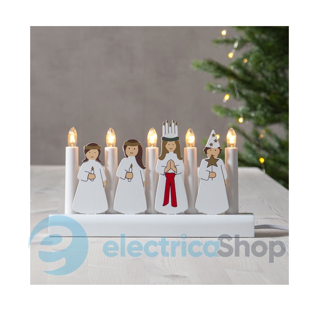Новорічна прикраса від EGLO допоможе задекорувати простір вітальні, спальні чи громадського приміщення. Підсвітка виготовлене з дерева, має 5 джерел світла у формі свічок. Світлі відтінки роблять предмет інтер'єру легким та акуратним. Такий декор можна поєднувати з іншими елементами або використовувати як самостійну прикрасу.